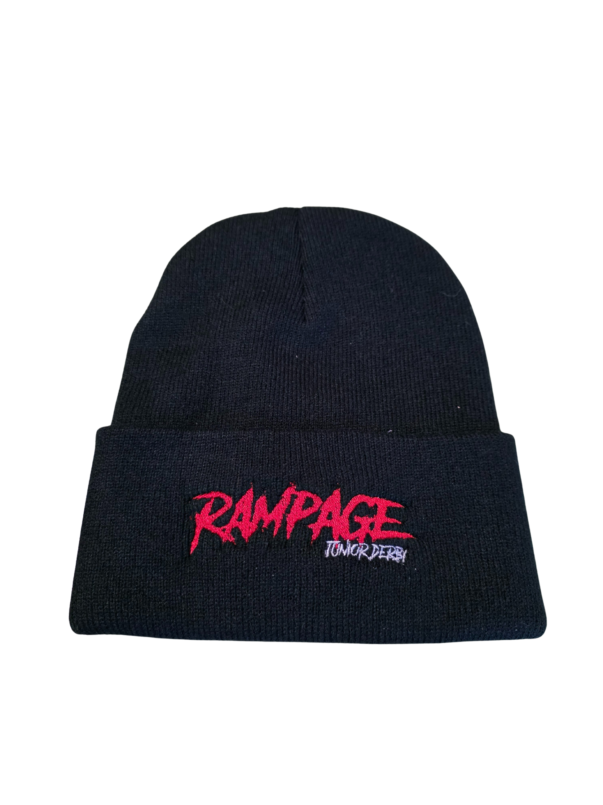 This black and red Rampage beanie features detailed embroidery and is designed to fit all sizes comfortably.