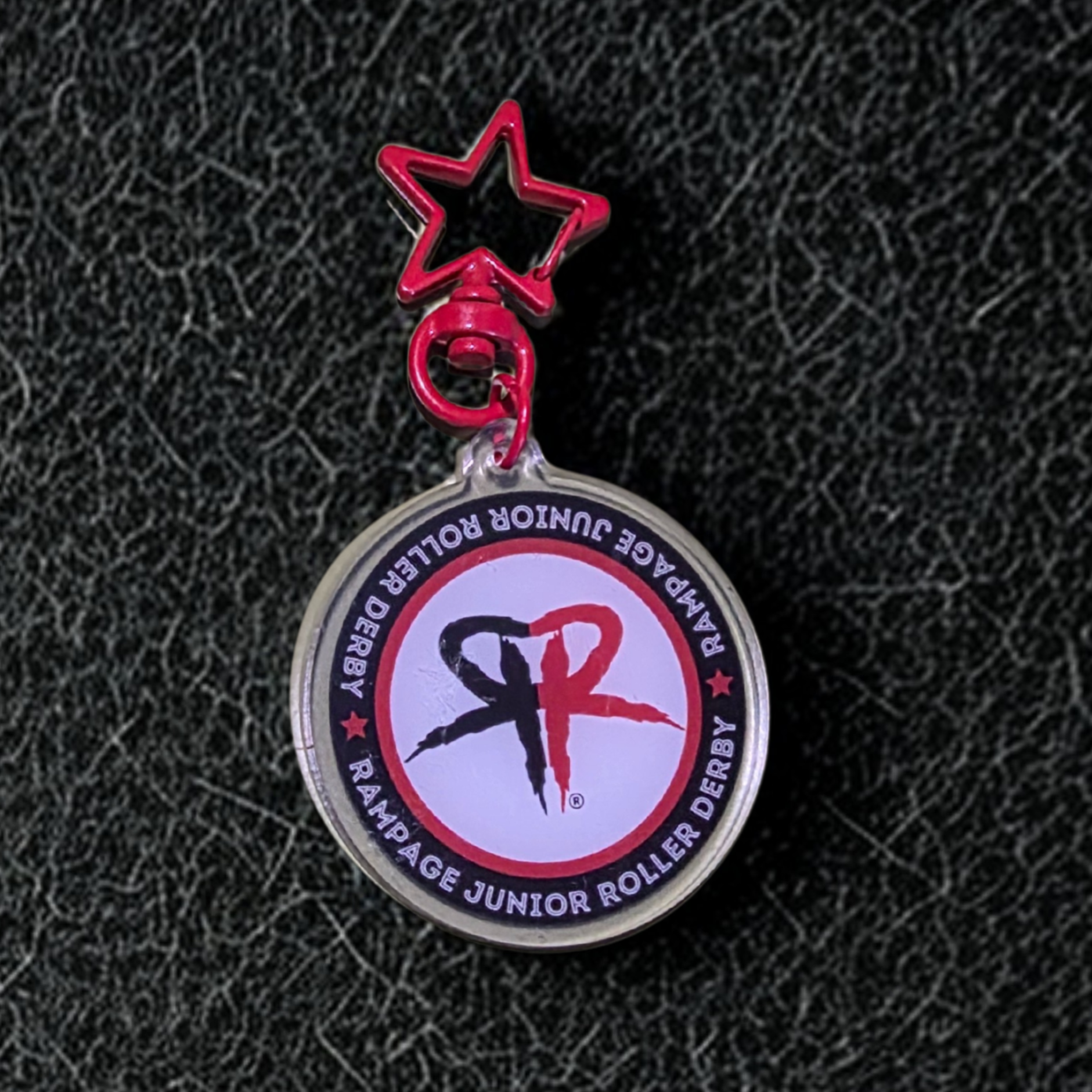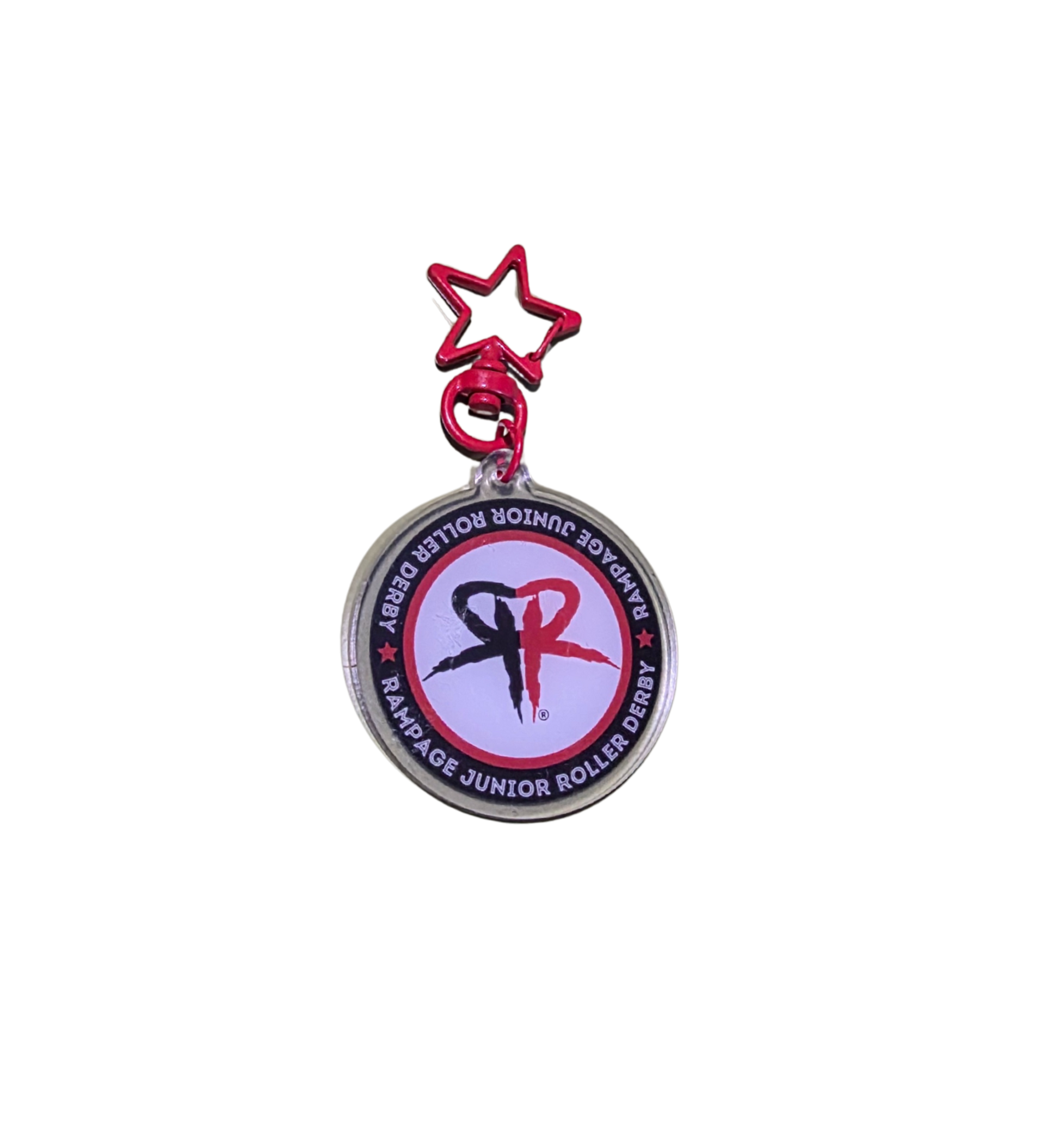 This 2-inch keychain features the iconic Rampage round logo crafted from clear acrylic, complemented by a durable metal star clasp for secure attachment.